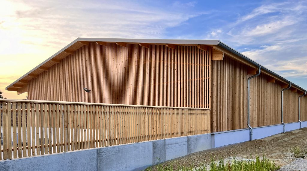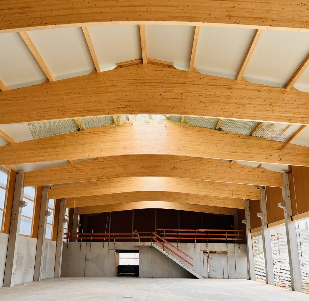 Die Kombination aus Stahlbetonrahmen und Brettschichtholz-Dachbindern (BSH) vereint hohe Tragfähigkeit mit einer nachhaltigen und optisch ansprechenden Bauweise.