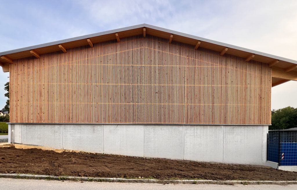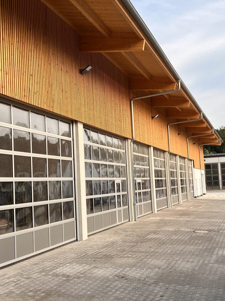 Für den Markt Gangkofen entstand eine moderne Einstellhalle für den kommunalen Bauhof in massiver Stahlbetonbauweise mit BSH-Dachbindern und einer ansprechenden Holzverkleidung.