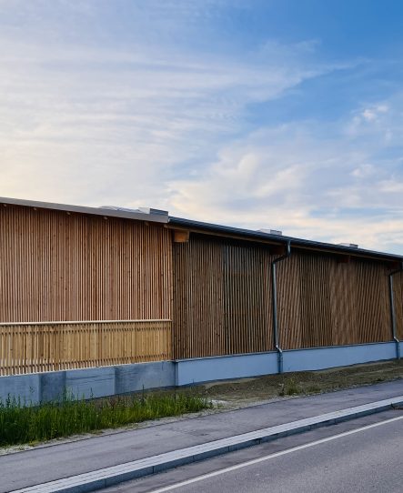 Das Holzgebäude ruht auf einer tragenden Flachdecke aus Stahlbeton, die über Stahlbetonstützen gegründet ist und somit wie auf Stelzen schwebt. Diese Bauweise ermöglicht eine effiziente Wasserhaltung unterhalb des Gebäudes.