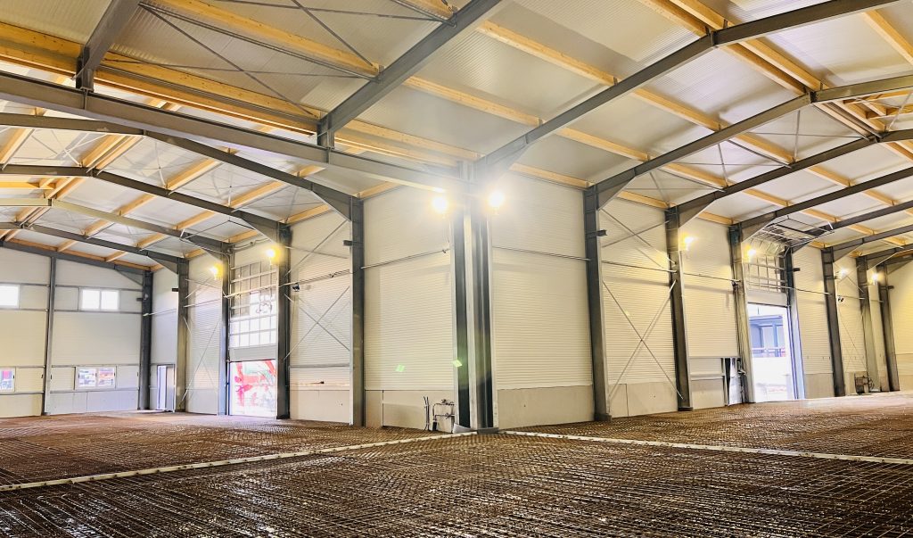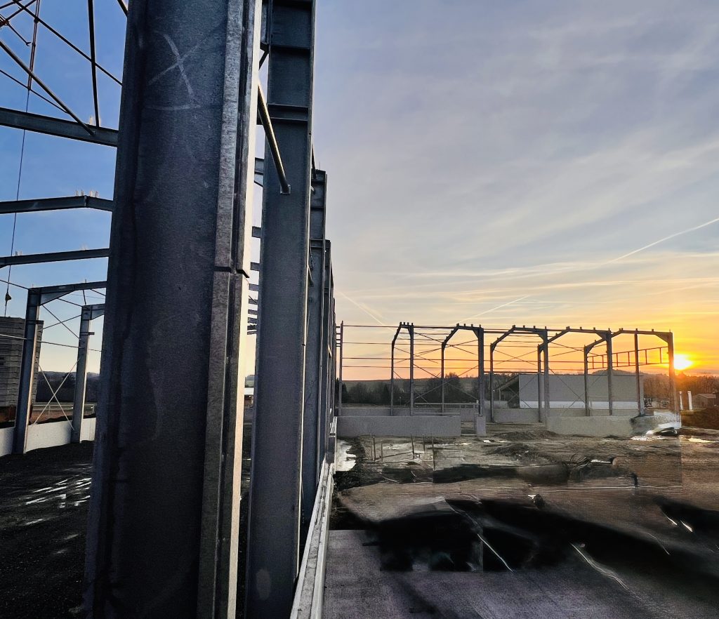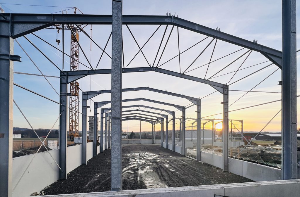 Neubau einer Lagerhalle aus Stahlbau für industrielle Nutzung.