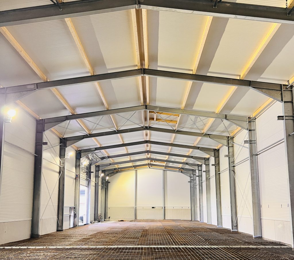 Für den Neubau einer modernen Lagerhalle in Stahlbauweise übernahmen WIMMER Bauingenieure die Tragwerksplanung. Die Halle wurde als Hallenrahmenbau mit biegesteifen Rahmenecken und eingespannten Fundamenten konzipiert, um eine wirtschaftliche und zugleich stabile Konstruktion zu gewährleisten.Zur Erhöhung der Funktionalität wurden zwei Hallenschiffe mit integrierten 5-t-Krananlagen realisiert. Die Tragstruktur besteht aus verschraubten, löslichen Stahlverbindungen, die eine einfache Montage und spätere Anpassungen ermöglichen.Durch die Kombination aus effizienter Stahlkonstruktion und durchdachter statischer Planung entstand eine robuste, flexible und zukunftssichere Halle für industrielle Nutzung.